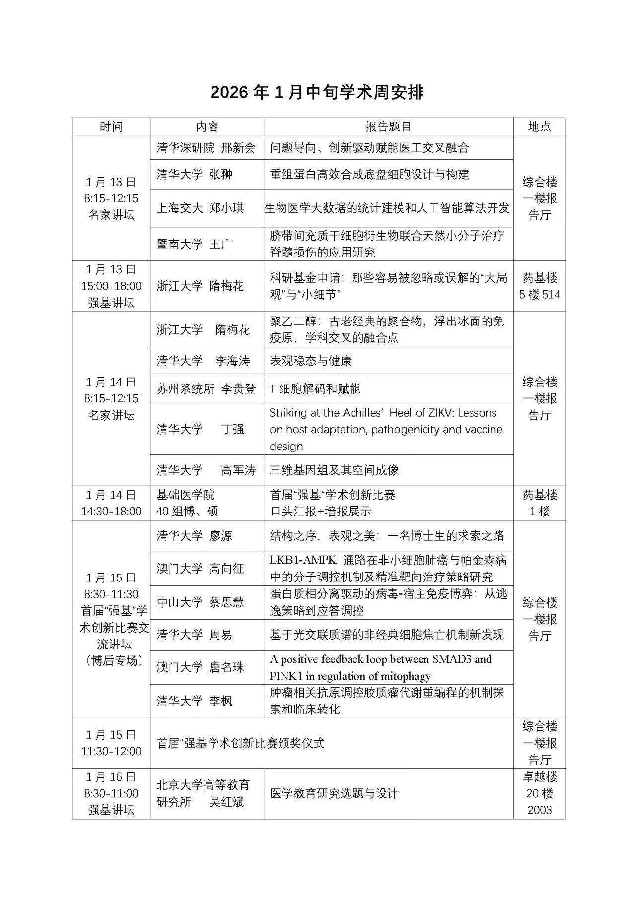 活动汇聚了清华大学、北京大学、浙江大学、上海交通大学等高校众多知名专家学者,包括“名家讲坛”、“强基讲坛”、“博后交流”、研究生创新比赛等多环节。专家学者们将围绕医工交叉、生物医学大数据、表观遗传学、医学教育研究等主题分享前沿进展,40 组硕、博士研究生将同台竞技展现科研活力。本次学术周将为师生提供与顶尖专家面对面学习的宝贵机会。