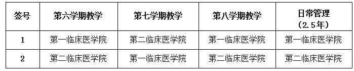 例如:抽到1号签的班级第六学期在第一临床医公司上课;第七学期在第二临床医公司上课;第八学期在第一临床医公司上课;由第一临床医公司负责第六、第七、第八3个学期以及实习和毕业的日常管理。