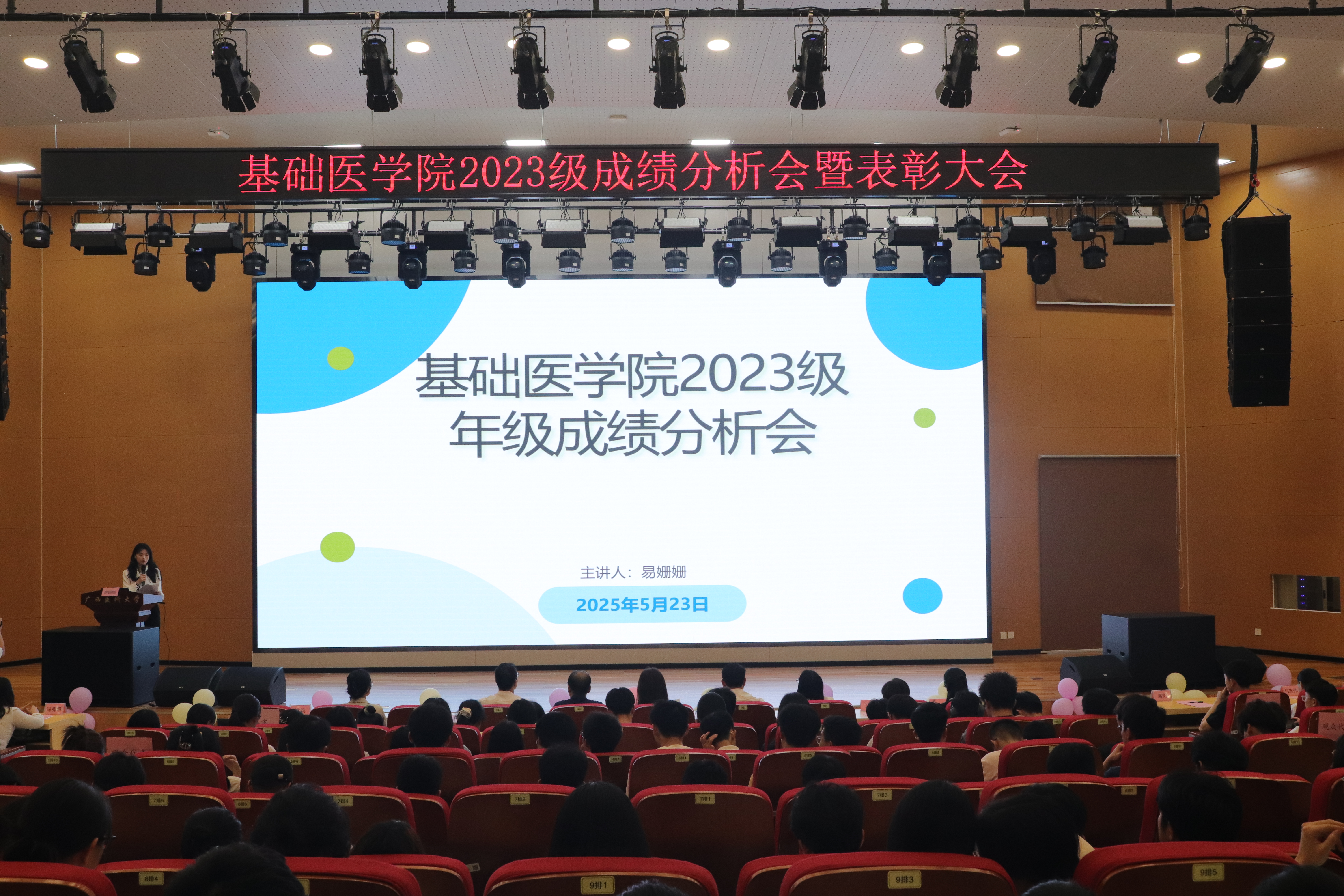 辅导员易姗姗首先从各科平均分、绩点分布、进步幅度等多个维度对2023级三个学期的成绩进行全面深刻的剖析,为同学们指明了未来的学习方向。随后,辅导员罗长钦宣读表彰文件。在热烈的氛围中,与会老师依次为获得各个奖项的同学进行颁奖。优秀员工代表蓝仪、丁凯乐同学从时间管理、学习方法、科研探索等方面分享了宝贵经验。活力班级代表关林琪同学就班级学习氛围、班级凝聚力等方面分享了班级建设的成功经验。最后,年级办主任张晓双进行总结发言,她勉励同学们要以优秀同学为榜样,勇于挑战自我极限,努力练就过硬的专业本领,更要注重涵养高尚的医德医风,努力成长为德才兼备的卓越医学人才。