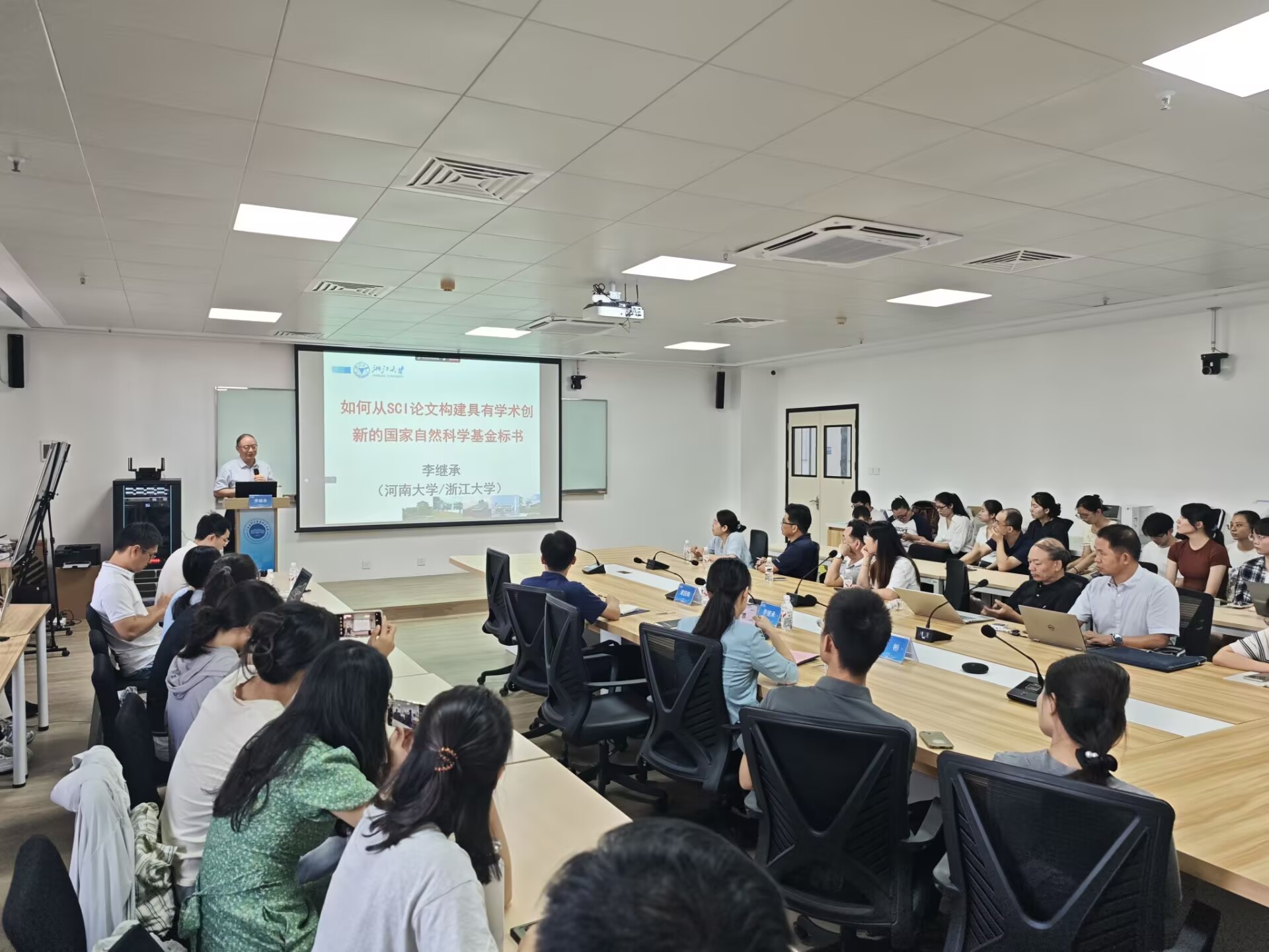 10月11日,李继承教授首先与公司领导班子就基础医学学科发展与博士学位授权点建设进行了深入座谈。10月12日,他以《如何从SCI论文构建具有学术创新的国家自然科学基金标书》为题,结合自身科研实践与基金评审经验,讲解了SCI论文的构思布局、科研素材积累方法以及如何将其有效转化为基金的选题策略与创新要点,并在现场为公司教师的基金申报书给予一对一指导。10月13日,李教授作《基于多组学和生物信息学分析的疾病生物学标志物研究》学术报告,内容翔实、视角前瞻,现场交流气氛热烈,有效拓宽了师生的学术视野与研究思路。